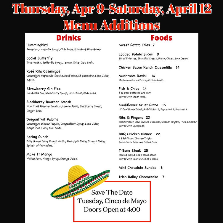 Wednesday 4:00PM until 11:00PM Thursday 4:00PM until 11:00PM FRIDAY 4:00 PM until 12:00 AM SATURDAY 12:00 PM until 12:00AM SUNDAY 12:00 PM until 9:00 PM